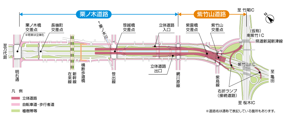 新潟国道事務所「みちナビ」より 👉みちナビによれば、栗の木バイパスとJRの交差付近より紫竹山ICに到る 高架道路ができるそうですが・・・。