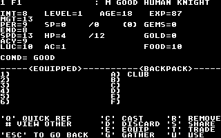 騎士は、どのキャラクターよりも最大のヒット ポイントと最高の総合戦闘スキルを備えています。 反対の配置であるか、別のクラス専用に設計されている場合を除き、彼/彼女はあらゆる武器や防具を使用できます。 より高い経験レベルでは、騎士は各戦闘ラウンドで複数回攻撃する能力を獲得します。 ナイトはマイト アンド マジック I の 6 つのクラスの 1 つです。 騎士は優れた戦闘タイプであり、あらゆる武器や防具に熟練しています。 彼らは呪文を唱えることができない 2 つのクラスのうちの 1 つで、もう 1 つは盗賊/強盗です。 ナイトになるには、キャラクターのマイト スコアが少なくとも 12 でなければなりません。 ナイトの基本的な打撃点の成長は、レベルごとに 1 ~ 12 ヒット ポイントです。