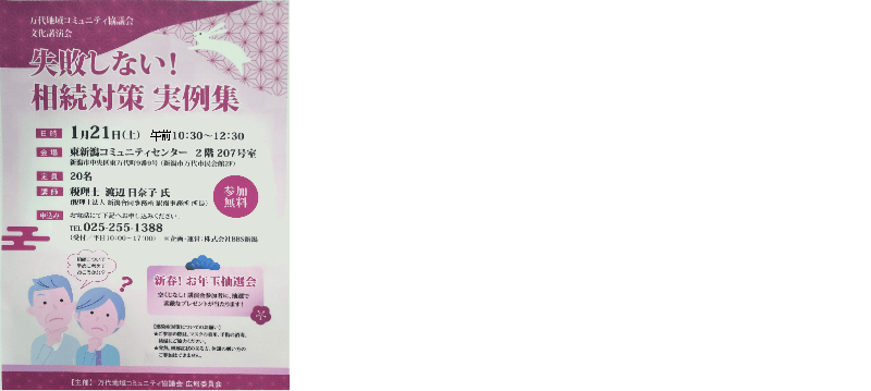万代コミ協では「失敗しない 相続対策実例集」と題して文化講演会を開きます。 税理士の渡辺日向子氏を迎えて1月21日午前10時半より東新潟コミュニティーセンター207号室で行います。 定員は20名です。新春お年玉抽選会も行いますのでふるってご参加ください。