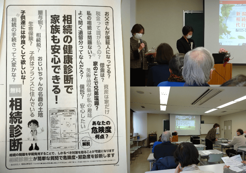 万代コミ協文化講演会『失敗しない 相続対策実例集』を開催しました。 では「失敗しない 相続対策実例集」と題して税理士の渡辺日向子氏を迎えて文化講演会を開きました。 in東新潟コミュニティーセンター207号室。日頃、遺産相続で悩む事例を掲げながらどのタイミングで相談すれば良いか 先生から事例を交えて教えていただきました。
