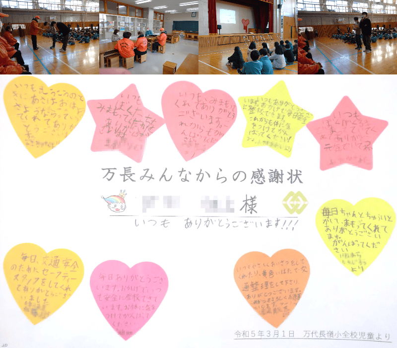 万代長嶺小学校校区で子どもたちの交通安全指導を行っているセーフティスタッフに 万代長嶺小学校の子どもたちからそれぞれのスタッフに感謝状が渡されました。