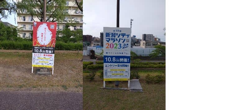 新潟市は新潟マラソン2023の募集を開始しました。やすらぎ堤に開催案内の看板が立っています。