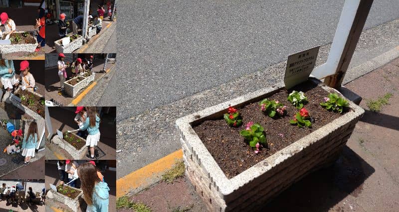 万代長嶺小学校の子どもたちによるフラワーロード、道路アダプト春の巻~が行われ、万代町通りの花壇に花が植えられました。