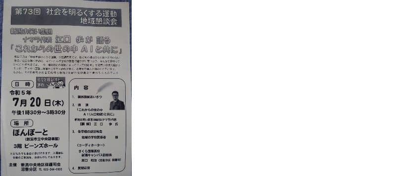 新潟中央保護司会の沼垂分区が主催するミニ集会の案内が届きました。 今回はお笑い集団NAMARAの江口代表より「これからの世の中~AIと共に」と題して講演をいただくことになりました。 入場無料、どなたでも参加できます。