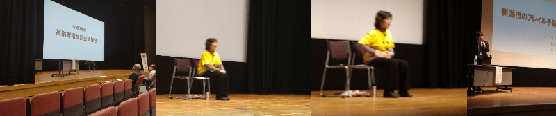 今回の研修会は二部構成ということで第一部に笑いヨガティーチャーの岡陽子氏による「笑って認知症予防」と題して 実践的な講演をいただきました。 岡陽子氏は、昔は変な宗教とかいわれ会場を貸してもらえなかった。 最近は新聞に取り上げられるようになった。 おかしくもないのにハッハッハッと笑うことで変われるように思えた。 笑いは心配ごとやストレスの悪循環を改善する効果がある。有酸素運動で認知症予防にもなる。 と、積極的に笑いの効用を実践すべくみなさんに促されました。 まずは基礎から 【基礎】椅子に浅く腰掛けて 手拍子しながら、ホッホッホッ、ハッハッハッを三回、次に手を挙げて「イェー」 手拍子しながら、いいぞ、いいぞ、手を挙げてイェー 手拍子しながら、ヤッター、ヤッター、手を挙げてイェー そして深呼吸、息を吐きながら下を向く腕も同様に、息を鼻から吸いながら上を向き手を挙げる。息を吐きながら下を向きます。 そして次の動作を加えていきます。 ①ムンバイ式。手を合わせて、アハハハといいながら下を向く→基礎 ②こぶしを握って前に突き出しながら、アハハハという。三回→基礎 ③ラブ注入。ハートを、手でかたどってラブ注入といって、前に突き出しながらアハハハという。三回→基礎 ④ハグ。自分を抱きしめらがらアハハハという。三回→基礎 ⑤(自分で殴り書きしたメモが読めなくて不明)→基礎 ⑥結んで開いてを歌いながら手拍子、足を動かす→基礎 など実践しながら有酸素運動を行いました。 おかしくもないのに笑っているとどこからかクスクスと自然に笑い声が聞こえてくる様になり会場は楽しい雰囲気に包まれました。 第二部には福祉部地域包括ケア推進課の岩谷圭太郎氏による「新潟市のフレイル予防事業について」と題し講演をいただきました。 フレイルというのは「医学用語で、frailty(フレイルティー)の訳で、病気ではないけれど、年齢とともに、筋力や心身の活力が低下し、介護が必要になりやすい、 健康と要介護の間の虚弱な状態のこと」をいいます。