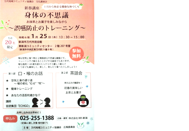来年(令和6年)1月25日に文化講演会『身体の不思議~誤嚥防止トレーニング』を開催いたします。