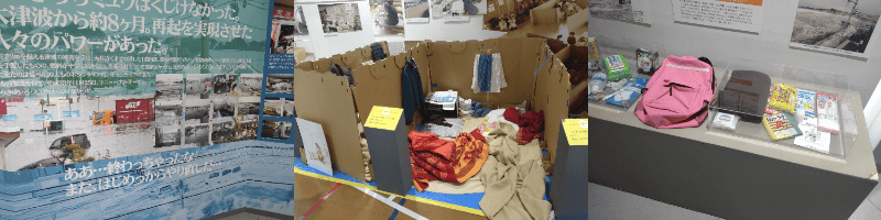 写真中央・右、避難所の段ボール部屋が当時の雰囲気のまゝ設置してあります。 こういった段ボール部屋が避難者全員に配布されるわけではなく、 配布されただけでも運がいい方といわれていました。