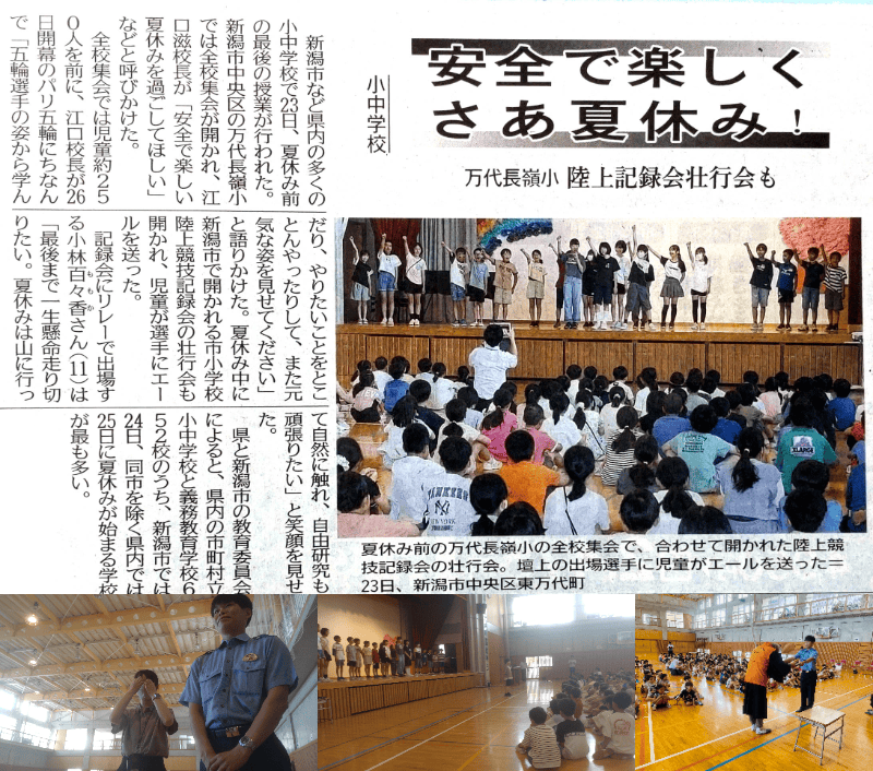 夏休み前日の全校朝会にて、地域の子どもたちの交通安全指導を行っているセーフティスタッフの表彰式がありました。 地元の新潟警察署より、長嶺コミ協会長推薦の川崎さんと万代コミ協会長推薦の武田さんが万代長嶺小学校全校生徒の前で、交通安全課課長さんより 表彰状が贈呈されました。併せて陸上記録会に出る選手の激励会が開かれ、翌日の新潟日報(R.06.07.24朝刊(一部補正))に掲載されました。