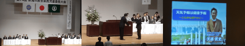 梅雨のしとしと雨の中、新潟県民会館で第74回民生委員児童委員大会が開催されました。万代長嶺地区からは30年で川崎会長が、同じく 20年で遠藤委員が永年勤続表彰を受けました。フジテレビ系列NSTで朝8時から放送している「めざまし8(旧めざましテレビ)」のお天気キャスターである 天達武史氏による「天気予報は健康予報」と題して講演会を行いました。