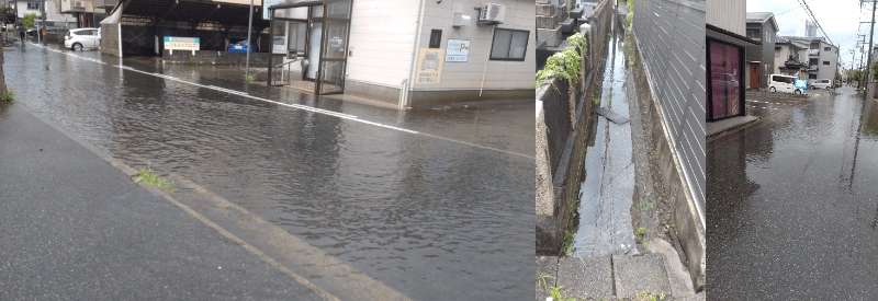 梅雨前線に台湾北上中の台風3号の湿った暖気の影響で、新潟北部から秋田にかけて線状降水帯が発生。新潟市中央区でも記録的短時間大雨情報が出され、各所で道路が冠水しました (昼頃には解消)。