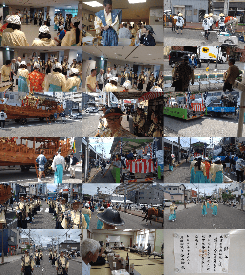 台風5号の近づく中、住吉行列が行われました。万代地域では江東地区として「川村奉行行列」が行われました。昨年はまだマスク越しでしたが、 今年から「松を植えよう!」のかけ声を行うことができました。
