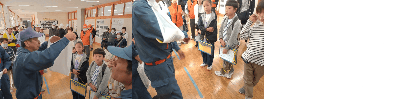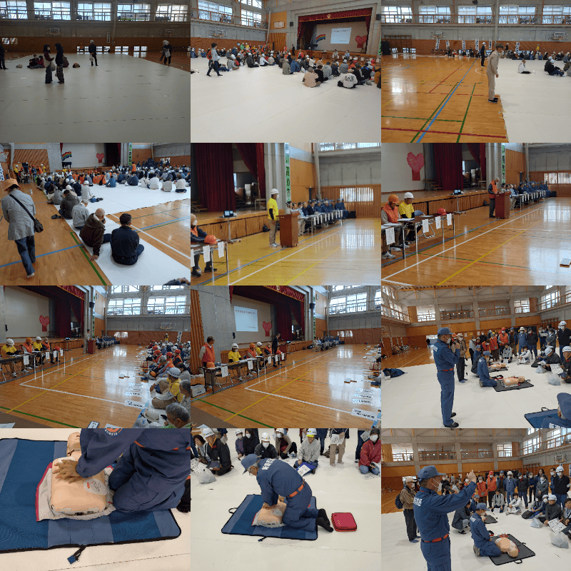 丸山長嶺コミ協安心安全部部長より開会宣言。丸田万代コミ協会長より挨拶。中央区東出張所石崎所長より挨拶。 万代長嶺小学校江口校長より20年前の中越地震の体験談を報告。当時校長は山古志小学校の教諭をしていましたが 土曜日で学校にはたまたまいなくて災難をのがれましたが、全村避難などの体験談を語っていただきました。続いて中央消防署 沼垂出張所(現在救急専門部署)の増田所長より挨拶をいただき、訓練内容を説明後に3グループに分かれて訓練を行いました。 途中子どもたちや保護者達も参加したので体育館はすし詰め所帯でした。