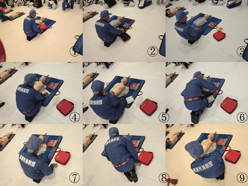 ②AEDを取り出します。⑤パッドを右胸と左脇の下に貼ります。⑥心電図計測中。⑨ショックボタンを押します。