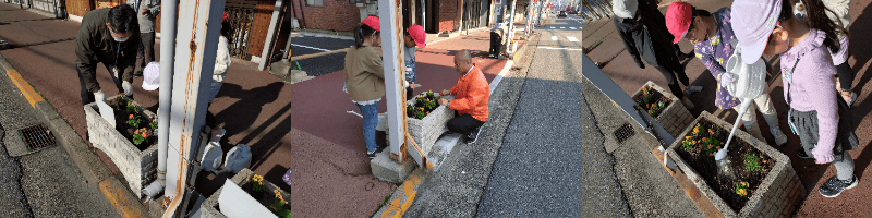 今季も花植の時期になりました。2年生が万代市民会館側、3年生が万代町通り側を地域のボランティアのみなさんと花植をしました。