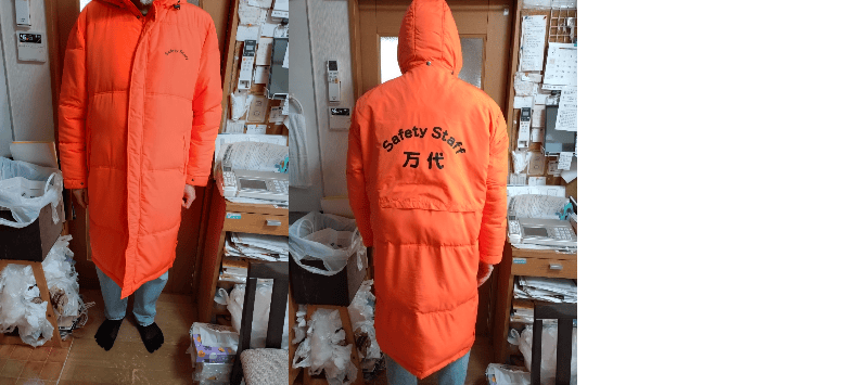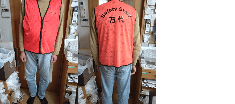 万代コミ協街づくり部会では、セーフティスタッフ、万代コミ協会員用の夏用のビブスとセーフティスタッフの冬用ベンチコートを作成しました。