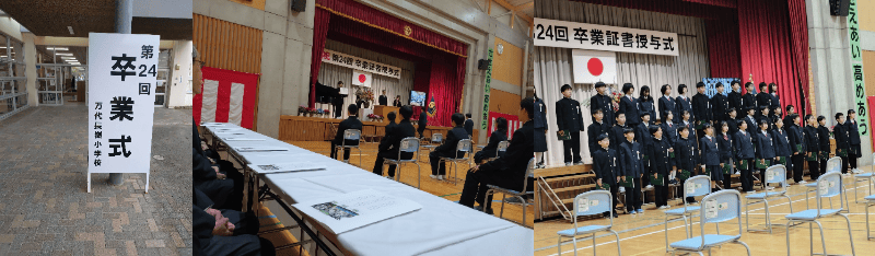 万代長嶺小学校で卒業式が行われ、コミ協会長、万代地域自治会長、セーフティスタッフが出席し、37名が小学校を旅立ちました。