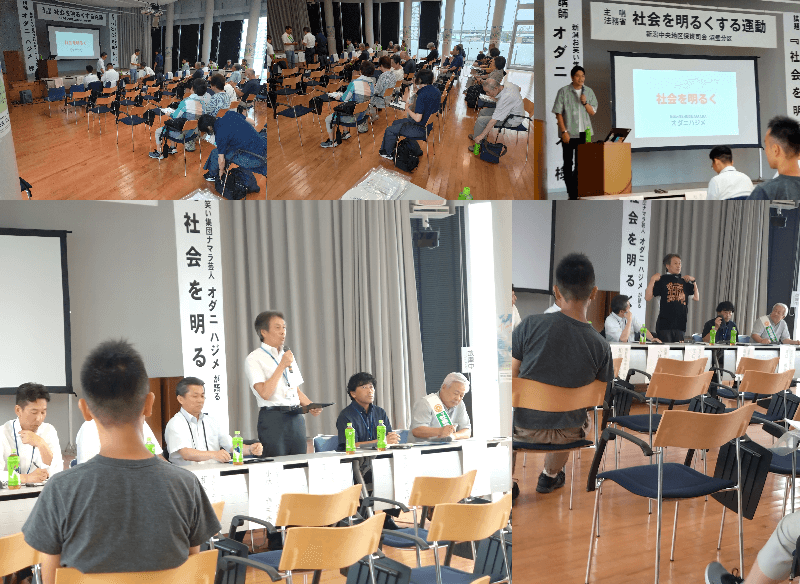例年行われている沼垂分区のミニ集会をほんぽーとのビーンズホールで行いました。富山のお寺の出身というオダニハジメ氏より、 「明るい社会」と題して講演を行っていただき、近隣の小中学校の校長による最近の小中学校の様子と夏休みの課題を報告していただきました。 約50名(来賓・スタッフ含む)参加。万代長嶺小学校は今年25周年。25周年を記念して福祉作業所さんろーどさんと共同で制作した25周年Tシャツが 大人気!生徒のみなさんも数多く購入して、結構な割合でそのTしゃつで登校してきます。