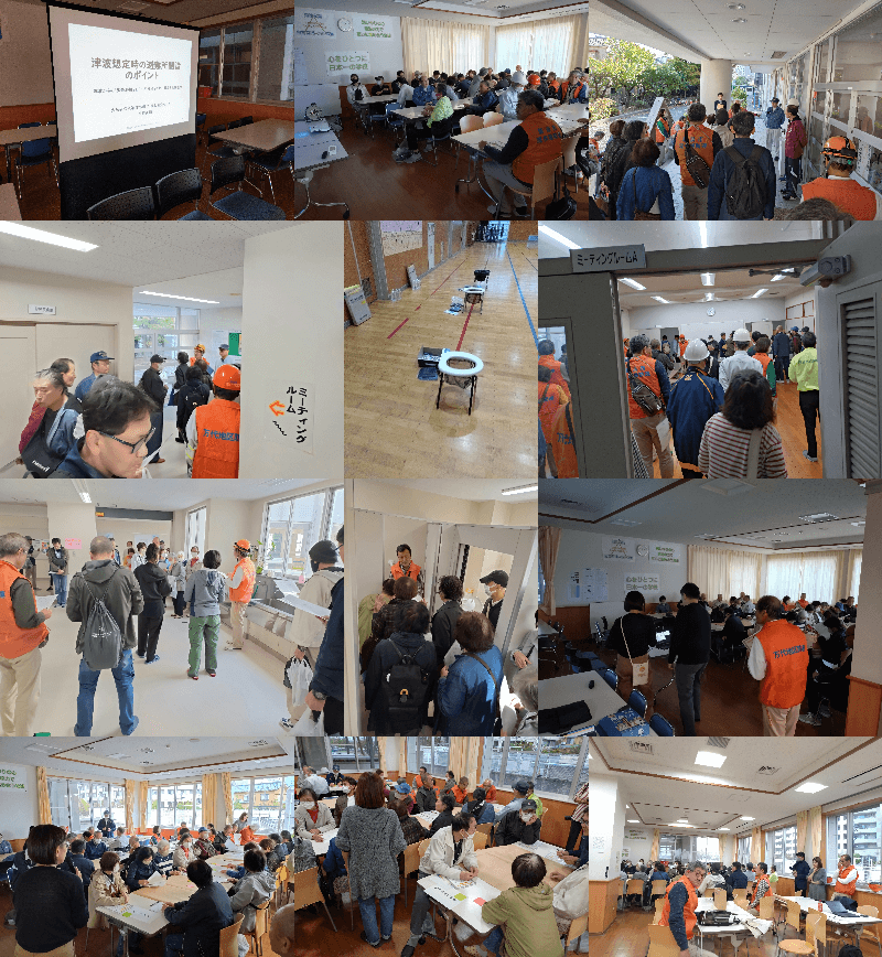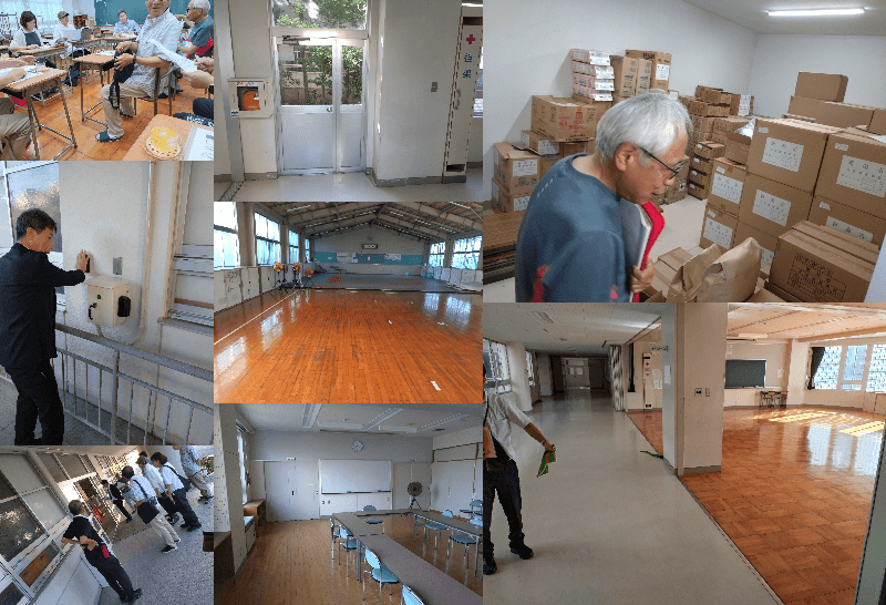 延長となった大リーグのワールドシリーズの放映中に後ろ髪を引かれるように、このために出て下さった 方も多くいらっしゃり当初よりも参加人数が大幅に増えて実に、ン10年ぶりとなる宮浦中学校での避難所開設 訓練を行いました。まずは多くの小中学校が取り入れているオートロックの玄関の開け方を参加者全員で 確認していきます。 自治体からJアラートが発令されると、通信により学校のキーボックスが30分間だけ開けることができます。 そこでオートロックを開けた後、玄関のオートロックを解除>本来の避難所入り口である体育館側の玄関を開け> 津波対策である3階。4階に避難するという手順を参加者で確認しました。 本来の避難所の運営を主幹するミーティングルーム(2階)と備蓄庫を確認(2階)、3階と4階の避難所の確認を 参加者で確認しました。新潟市の想定では3千人収容とありますが、実際に避難所と使える教室等はそれほど 多くないため、そこまで余裕のある避難先にはならない予感がします。 最後に大阪公立大学の生田教授による実際の津波時の避難行動や避難所でのトイレの使い方に関する ワークショップを行いました。
