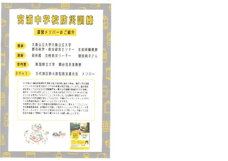 宮浦中学校で行われる避難訓練を11月2日を迎えるに中って、避難経路や避難場所、学校のオートロックの解除方法や避難場所として使用される施設、 避難物資の確認が行われ、足りない物をどう補充するか、見学に中っての注意点などを確認しました。