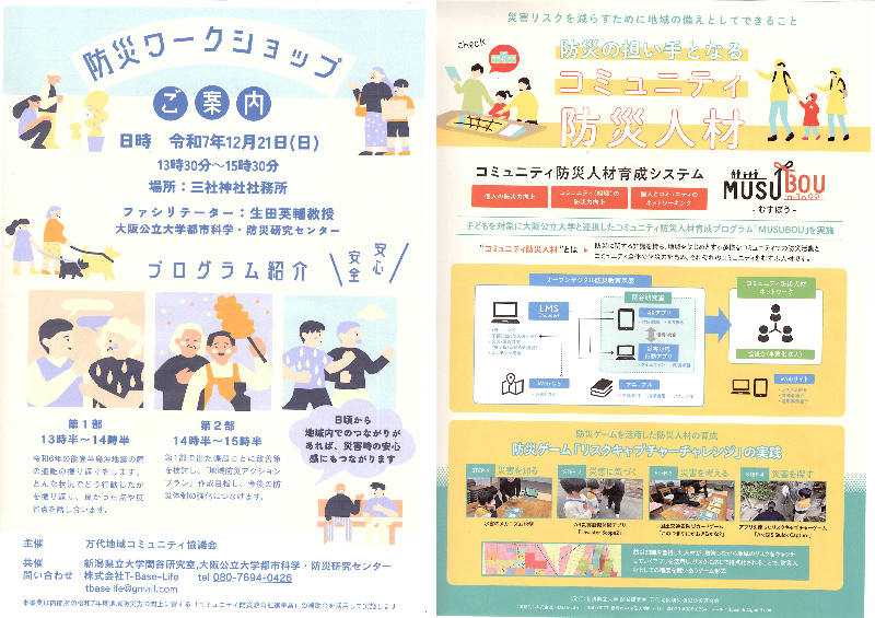 令和7年12月21日に三社神社社務所でファシリテーター(会議やグループワークなどの場で、 中立的な立場から議論を促進し、参加者の相互理解や合意形成を支援する役割を担う人)に大阪公立大学の 生田教授をお招きして防災ワークショップを行います。