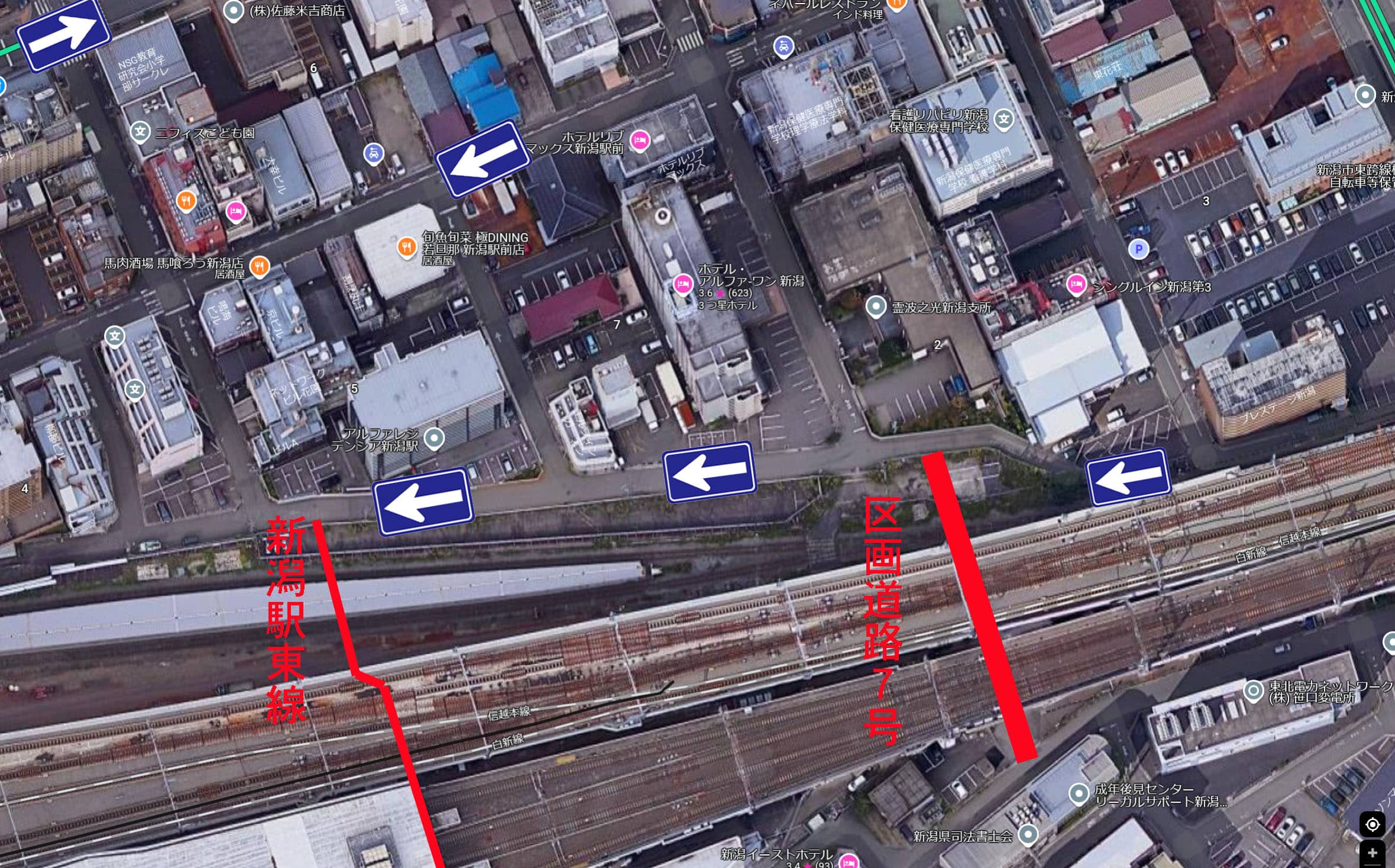 区画道路7号はホテルα1の隣、霊波之光(宗教団体)施設の裏にあたります。 線路沿いの路は東跨線橋側から新潟駅方面の一方通行のため新潟駅方面からのアクセスは必ずしも利便性があるとはいえません。