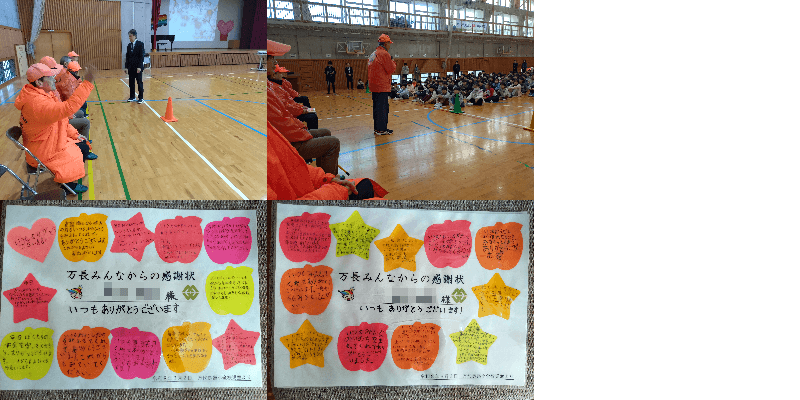 万代長嶺小学校の体育館でセーフティスタッフ感謝の会が開かれ、子どもたちから感謝の歌と感謝状をいただきました。 6名出席(長嶺地域3名・万代地域3名)。
