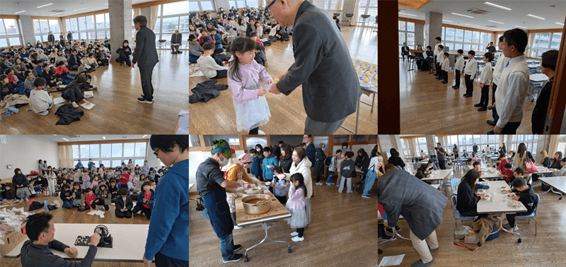 万代コミ協と長嶺コミ協の共催でお楽しみ会(新1年生の入学と6年生の卒業を祝う)を万代長嶺小学校のランチルームで開催しました。 184名参加(スタッフ含む)。新1年生23名に鉛筆を、卒業生11名にシャープペンシルをそれぞれ渡しました。 万代小学校に縁を保つ新潟少年合唱団による合唱とビンゴゲームで大盛り上がりを得て、カレーで締めくくりました。 外は雪のちらつく天気でしたが大盛り上がりでした。