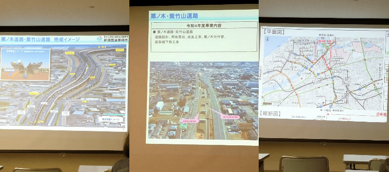東コミセン207号コミュニティルームにて午後7時より、新潟市の道路計画課から2名と国土交通省新潟国道事務所から2名より令和四年に事業化された「沼垂道路、万代島ルート線」に関する説明会が地域住民代表とコミ協役員を対象として行われました。このページは事業説明と質疑応答についてまとめました。 最初に担当者から挨拶を受け、スライドにより万代島ルート線に関する説明を20分、その後質疑応答となりました。 当初8時に終わる予定でしたが、だいぶ超過してしまいました。 ※ 質疑応答に関して質問者は姓イニシャルとさせていただきます。 ※ 重複する質問がありますが時系列に沿って進行しています。