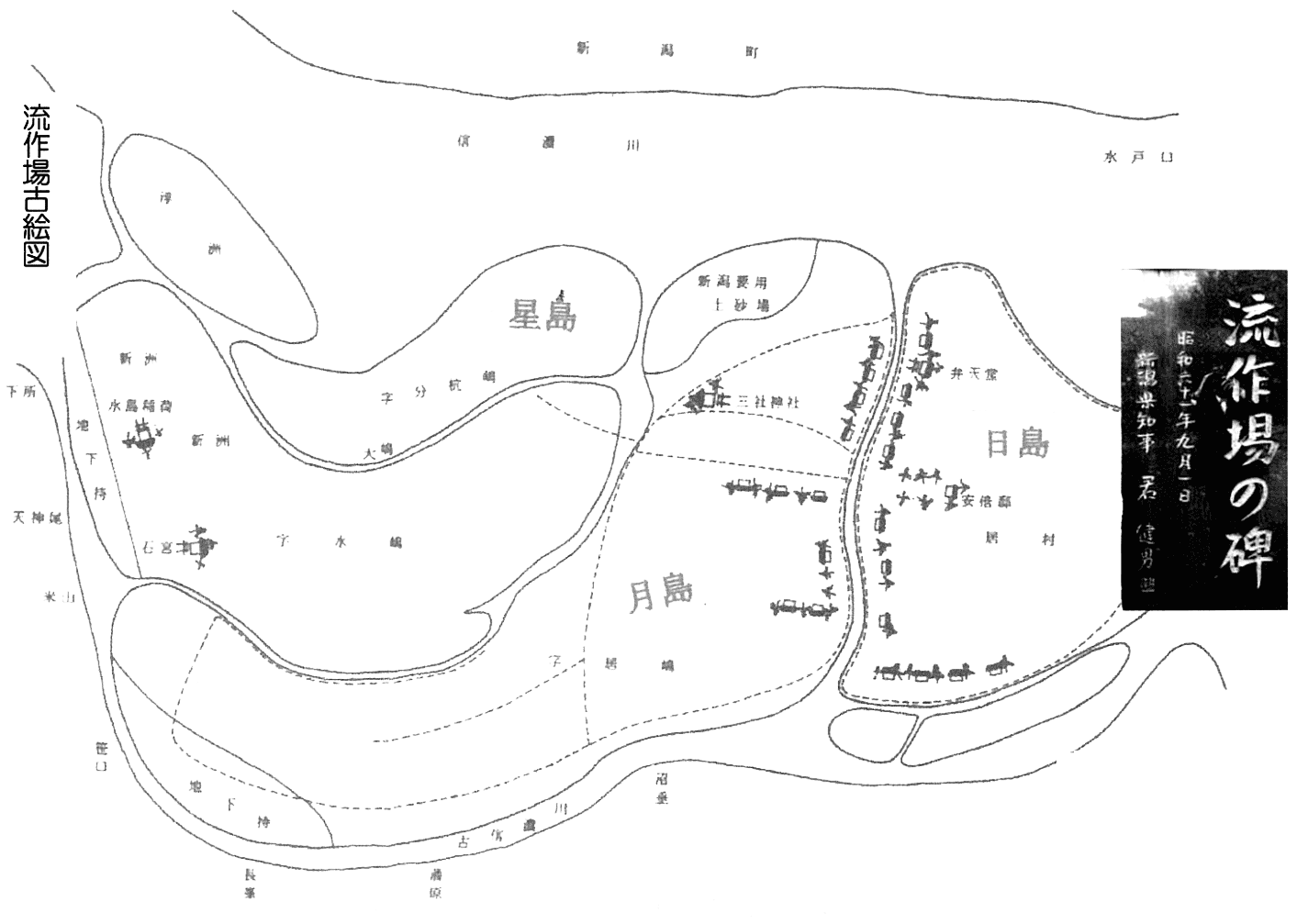 当地、流作場は延享3年(1746年)に安倍玄的(あべげんとき)様が信濃川の島嶼(とうしょ)を開拓して住家15軒にて玄的村を開くに始まる。