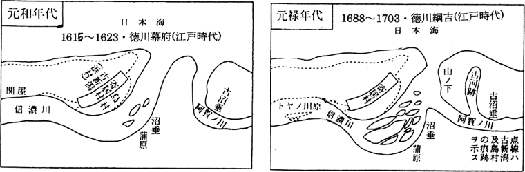 此の為沼垂、蒲原両港は水流の変化による川欠けで次第に陸地が削られて港湾都市機能が著しく低下し蒲原港は衰微して終った。沼垂は機能回復のため延宝7年(1979)王瀬に掘割を開鑿した。