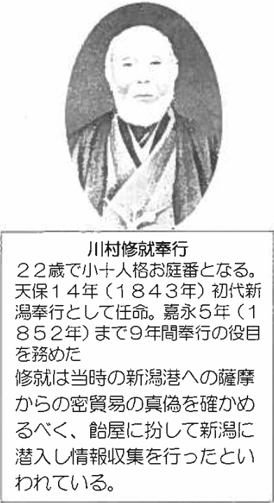 天保14年(1843)6月川村修就は新潟奉行を拝命する。幕府は新潟を長岡藩から上知することに成功した。新潟幕府よる支配体制を固め、日本海側の防備を進めることが任務であった。 川村はその主要な任務だけでなく、新たに幕府領となった新潟町を支配するため、また街の治安を安定させるため、様々の制度を進めた。 それと共に以前から長岡藩のもとでずっと行われていた砂防林の造成を積極的に推し進めた,川村奉行行列は、新潟まつり江東地区実行委員会が実施し、 8月7日のまつり行列(現在は8月の第1(もしくは第2)土曜日に開催)の万代地区の先導役として重要な役割を担うまでになって、 すでに11年、地元でも歴史ある行事となった。新潟まつりは80万人の人出で賑わいました。
